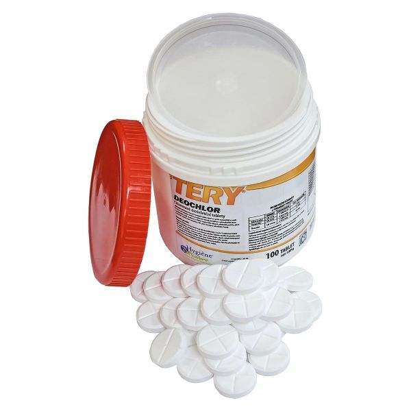 Šumivé dezinfekční tablety DEOCHLOR na bázi aktivního chlóru určené k dezinfekci všech odpadů a sanitárního zařízení ve zdravotnictví a potravinářství. Používá se také k dezinfekci plivátka ve stomatologii. Ve vodném roztoku má kompletní dezinfekční účinek včetně SPORICIDNÍHO. Pevné a nedrolící se tablety umožňují snadné použití a přesné dávkování. Dezinfekci provádíme každý den po ukončení pracovní směny tak, že tabletu lehce přelijeme vodou a necháme působit po dobu 30 minut, pak spláchneme.