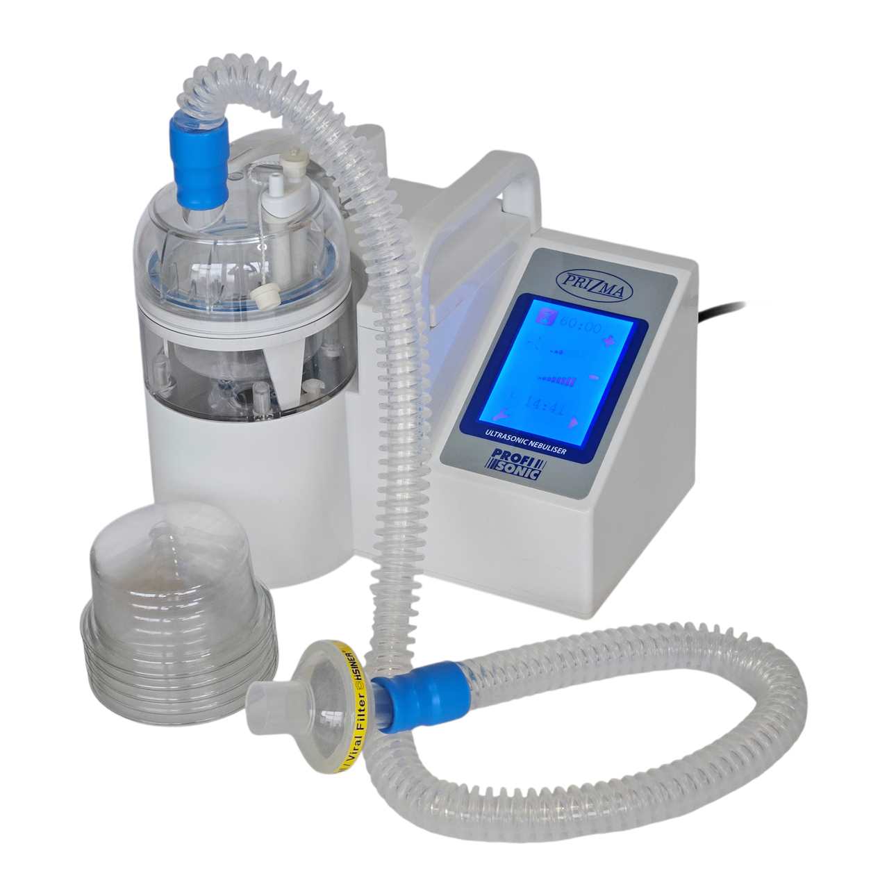 Profesionální ultrazvukový inhalátor PROFISONIC PRIZMA pro nemocnice, respirační léčebny a kliniky, léčebné lázně. INHALÁTOR PROFISONIC s velkým dotykovým LCD displejem na kterém lze nastavit čas, objem proudění a rychlost tvorby, velikost částic. Jedná se o podobný nicméně technicky modernější přístroj jako např. podobný OMRON. Nastavitelný výkon 0 až 3ml / min, nastavitelné proudění až 20 litrů / min, nastavitelná velikost částic 0,5 a 5 mikronů, nastavitelný časovač 1 až 100 minut. Součástí dodávky je inhalační maska ADULT a BABY, vrapová inhalační hadice, inhalační náustek a 3 kloboučky na medikamenty. Přístroj je zdravotnický prostředkem třídy IIa. Jedná se o repasovaný výrobek s plnou zárukou.